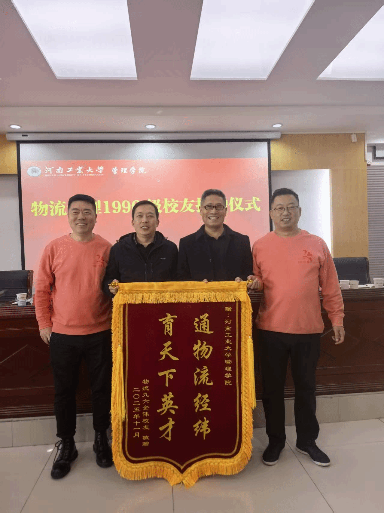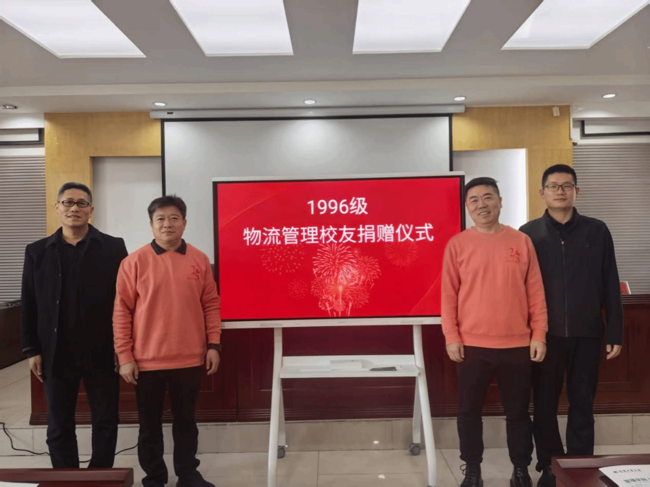座谈结束后,捐赠仪式顺利举行。物流管理1996级校友向母校捐赠一台会议平板,校友与基金工作办公室副主任王欣欣、管理学院院长李凤廷共同代表学院接受捐赠;此外,校友们还向母校赠送“通物流经纬,育天下英才”锦旗,由管理学院党委书记李国仓与院长李凤廷共同接收。这份捐赠不仅是物质上的支持,更承载着1996级校友对母校与专业的深情厚谊,是薪火相传的精神象征。随后,全体参会人员合影留念,镜头定格下这一温情而有意义的瞬间。