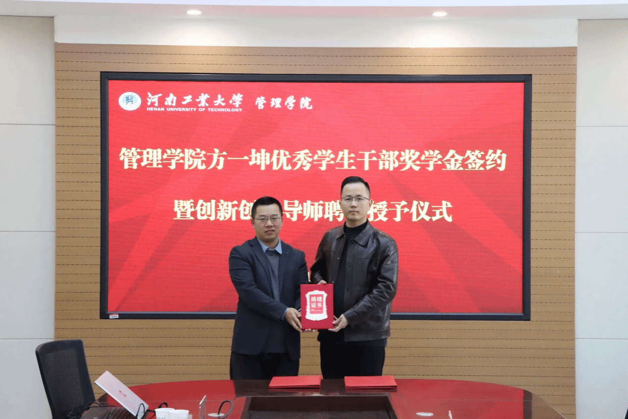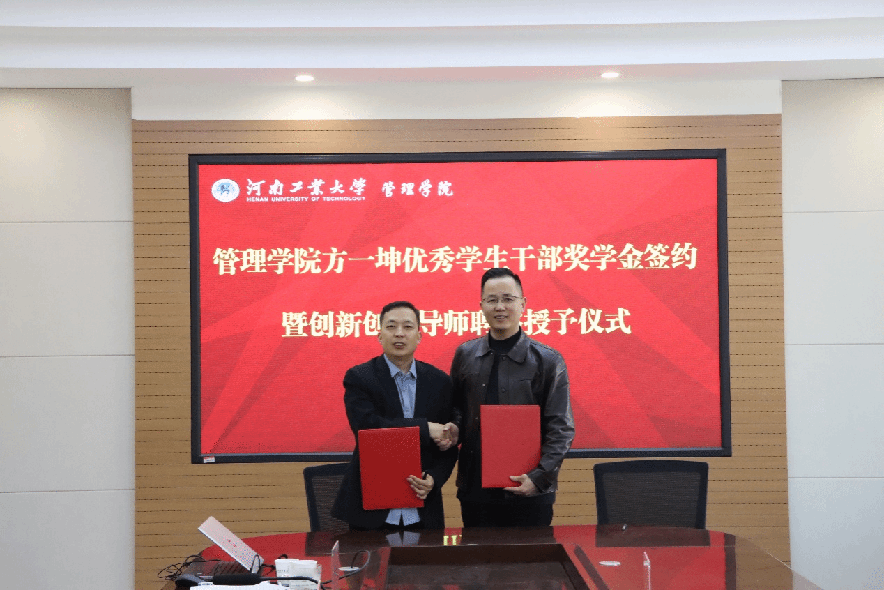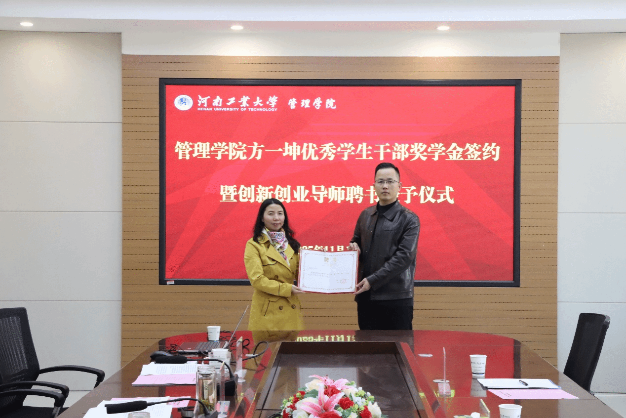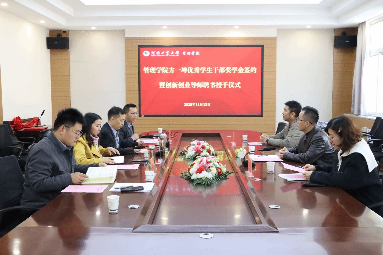11月13日,管理学院“方一坤优秀学生干部奖学金”签约暨创新创业导师聘任仪式在博识楼3558会议室举行。方一坤集团总裁宋东方、人力资源部行政经理郑雪、新媒体运营部经理郭子恺,管理学院党委书记李国仓、党委副书记曹启娥、副院长穆庆榜、党政办李景理及相关教师出席活动。仪式由穆庆榜主持。