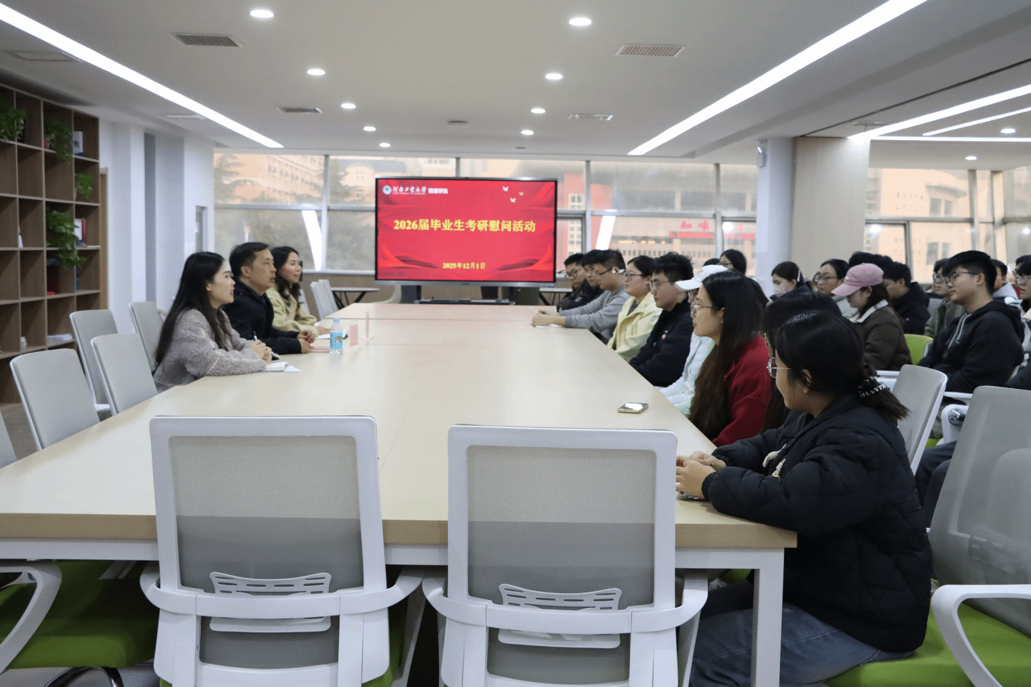 考研冲刺倒计时之际,为帮助考研学子缓解备考压力、坚定上岸信念,12月1日下午,管理学院在德园“一站式”学生社区开展2026届毕业生考研慰问活动,学院党委书记李国仓、党委副书记曹启娥及考研学生代表参加,活动由学院团委书记、22级辅导员郑媛媛主持。