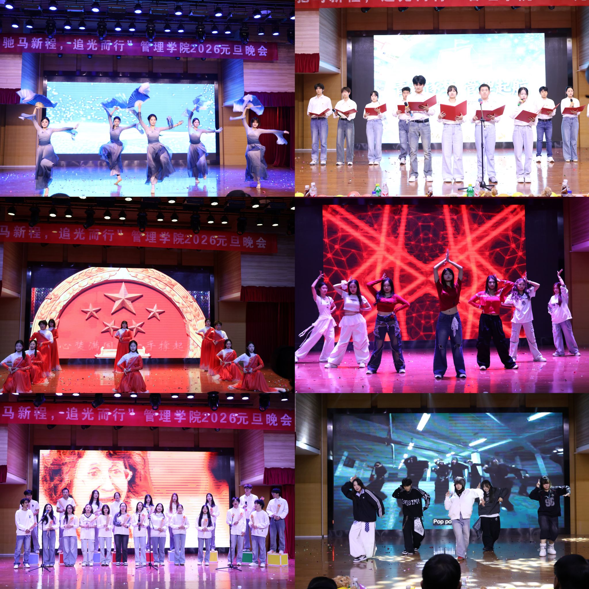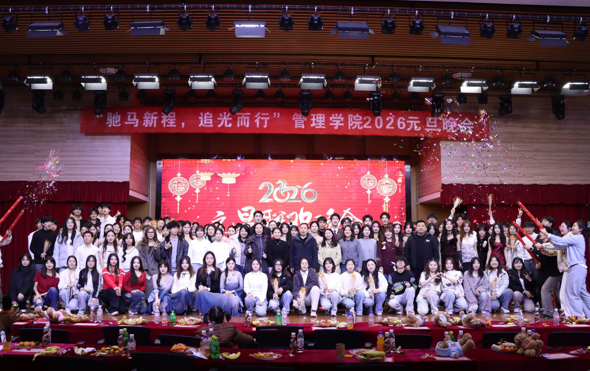 管理学院始终坚守立德树人根本任务,以校园文化活动为重要载体,深入践行“以文化人、以文育人”理念,持续提升人才培养质量。此次元旦晚会的成功举办,不仅为学生搭建了展示才华、交流情感的优质平台,更有效凝聚了全院上下砥砺奋进的向心力与凝聚力。站在2026年的崭新起点,管理学院全体师生将继续秉持“进德修业,治国经邦”的院训,以梦为马、笃行不怠,在教学科研的深耕与求学成长的探索中勇攀高峰,共同书写学院高质量发展的崭新篇章。