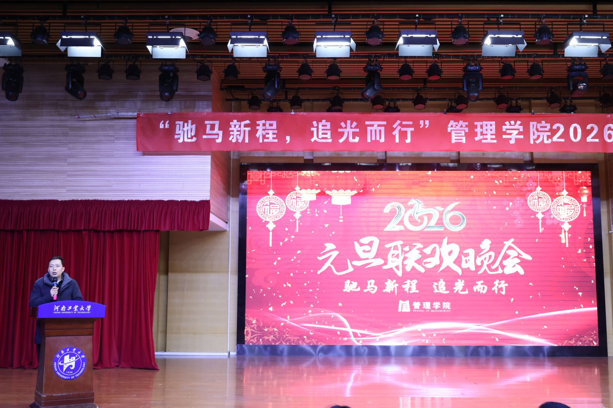 一元复始启新章,万象更新逐光行。为欢庆元旦佳节,丰富校园文化生活,凝聚师生奋进力量,1月5日晚,管理学院“驰马新程,追光而行”2026年元旦晚会在25201活动厅温情启幕。校党委学工部部长王迪,就业创业中心主任周志强、副主任王萌,校团委副书记李凯歌莅临晚会现场指导,学院党委书记李国仓、院长李凤廷、党委副书记曹启娥、全体辅导员老师、教师代表及现场观众共400余人齐聚一堂,共赴这场青春洋溢的文化盛宴。晚会由王晓航、谢亚烔、李响、郭润泽四位同学联袂主持。