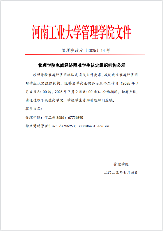 管理学院家庭经济困难学生认定组织机构公示