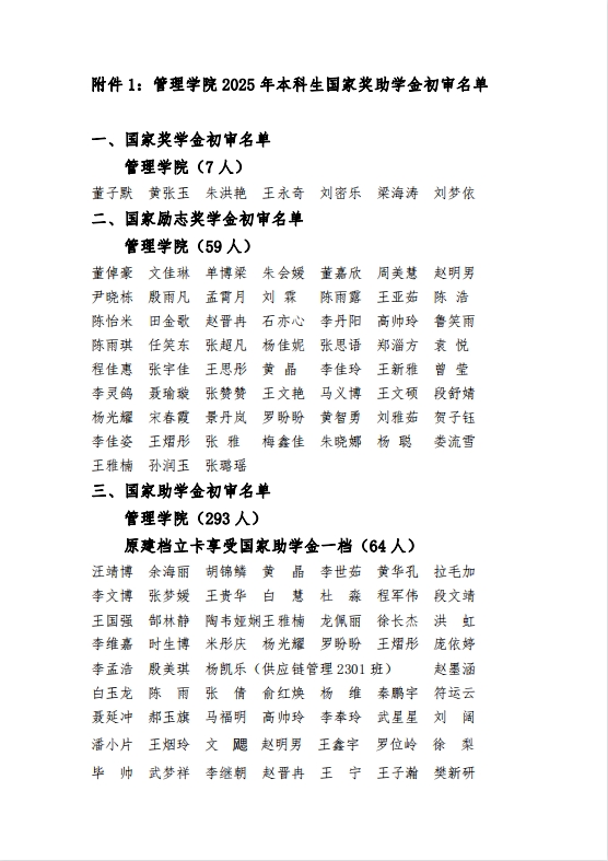河南工业大学管理学院2025本科生国家奖助学金初审名单