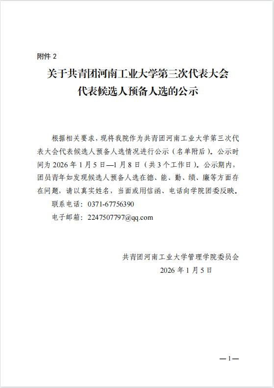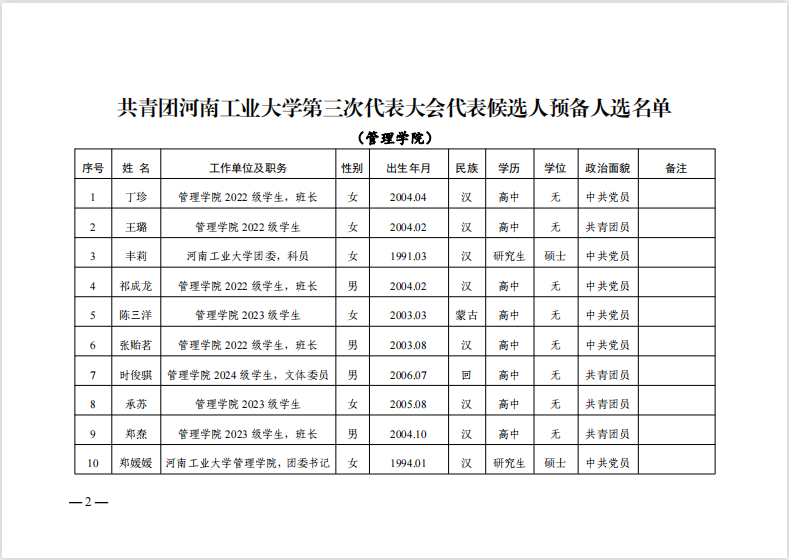 关于共青团河南工业大学第三次代表大会 代表候选人预备人选的公示