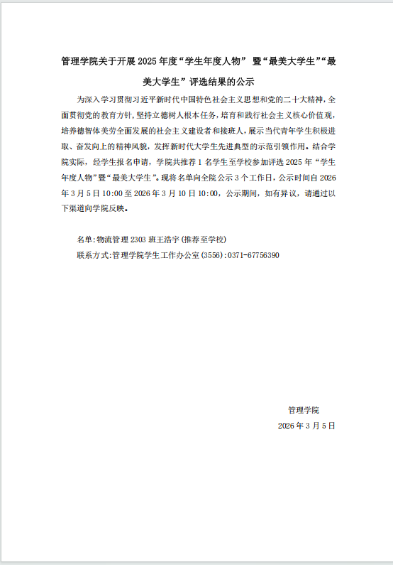 管理学院关于开展2025年度“学生年度人物” 暨“最美大学生”“最美大学生”评选结果的公示