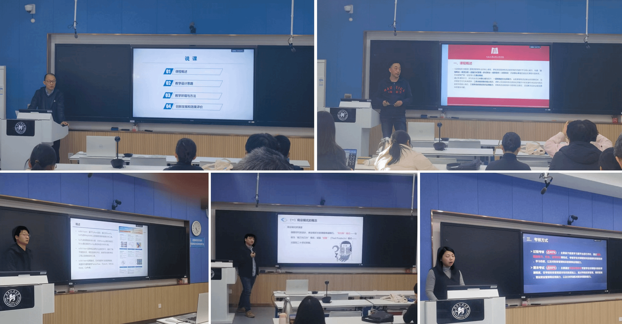本次观摩展示活动中,王焰、宋庆波、李阳、王志刚、谢楠等五位教师依次登台授课。他们围绕各自负责的课程,从教学设计、实施过程、特色创新、教学反思等多个维度,详细分享了课程建设与实施的具体情况。展示环节结束后,师生们围绕教学环节优化、重难点突破、学生参与度提升等问题展开了热烈的交流研讨。