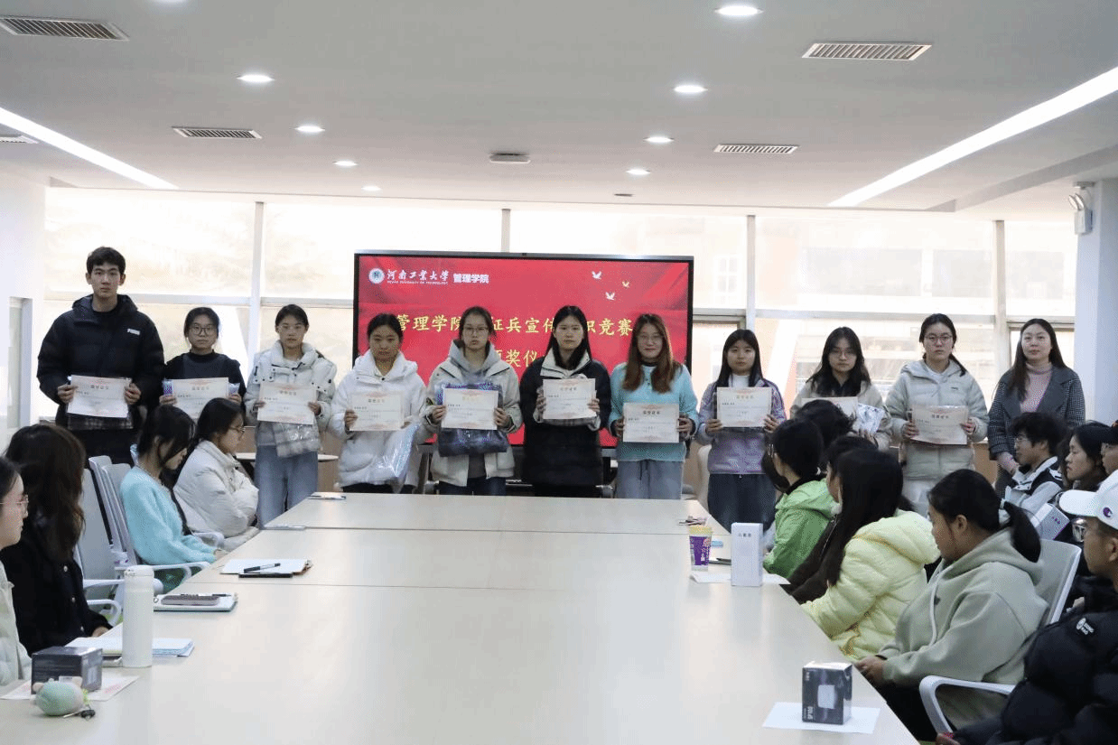 11月1日-15日,管理学院积极响应国家征兵工作号召,扎实推进国防教育普及,成功举办线上征兵知识竞答活动。管理学院各年级数百名同学踊跃参与,答题氛围热烈,取得了良好的宣传教育效果。为表彰先进、激励更多同学关注国防事业,11月24日,学院在德园一站式社区举行了颁奖仪式。