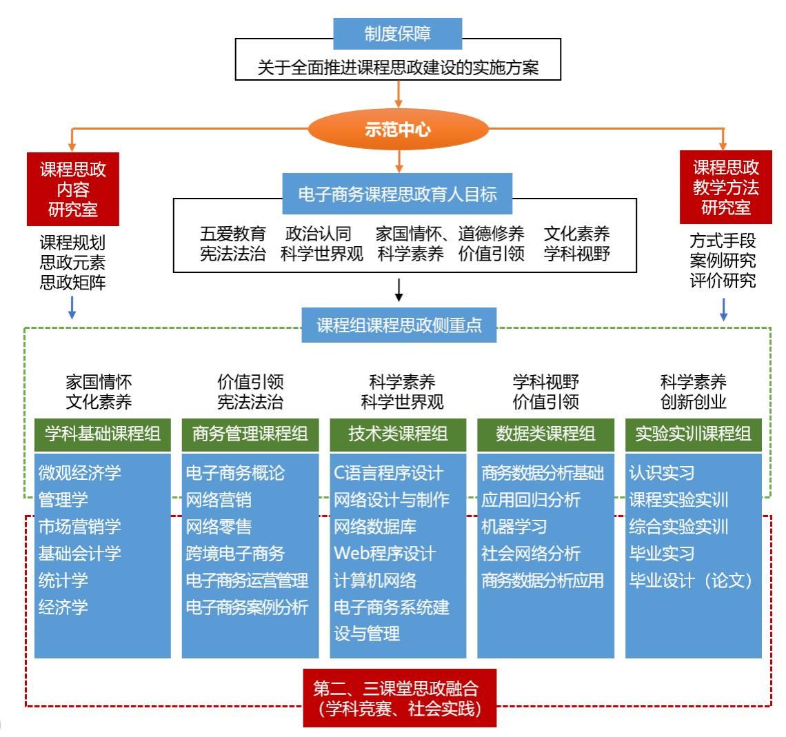 基于电子商务学科专业特点,中心构建“1-2-5(一个中心、两个研究室、五个课程组)”课程思政研究模式(如图1所示),深度发掘整合不同学科的思政要素,在思想上同心、在目标上同向、在行动上同行,最终形成全员育人、全过程育人和全方位育人格局,着力提升人才培养质量。